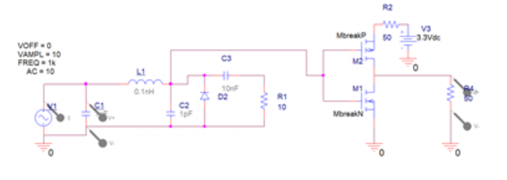 下图显示了一个简单的子电路,该子电路将输入信号转换为正脉冲输出。还有许多其他组件用于显示此电路中的各种可能的测量点。在该电路中,有一个正弦波源,一个输入pi滤波器(低通),最后是一个CMOS反相器。我们想看看在包含直流和交流部分的这种类型的电路中电流和电压的分布情况。