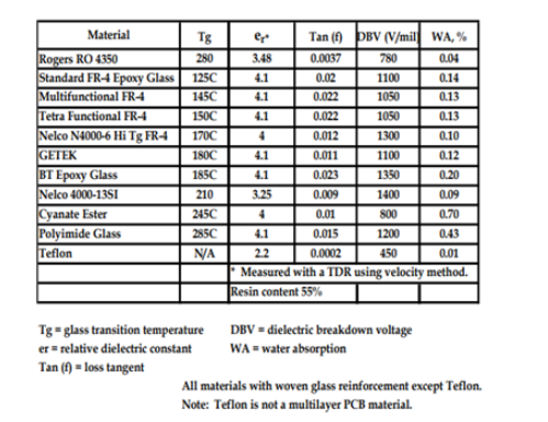 表1中的信息表明,用于制造多层PCB的大多数材料具有相对较高的损耗。(要归类为低损耗,损耗角正切应低于.004。)