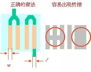 如果相邻的焊盘需要相连,首先确认在外面进行连接,防止连成一团造成桥接,同时注意此时的铜线的宽度。