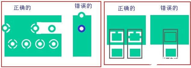 如果采取左边的方式的话,在焊接或者维修拆卸元器件时比较困难,因为温度通过铺的铜把温度全面分散导致焊不上鱼差不下。