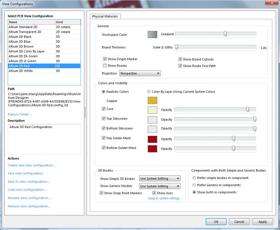 按下快捷键“L”可以打开如下图所示的PCB3D显示设置对话框,可以根据板子的实际情况设置相应的板层颜色,存储或者调用已经存储的板层颜色设置。这样,3D显示的效果会更加逼真。