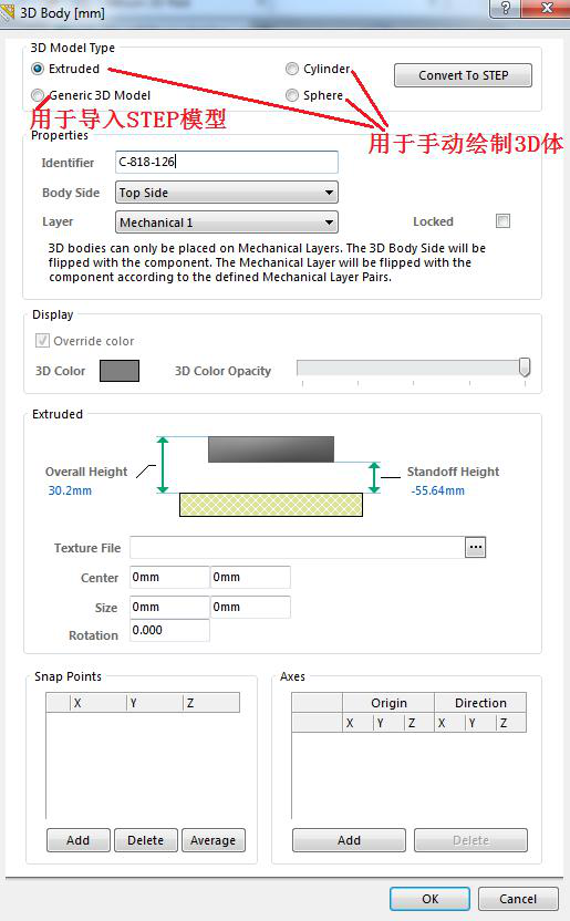 虽然他们可能有不同的方向,STEP模型往往和PCB的封装一样都有其原点。在模型的原点中添加捕捉点可以帮助他们进行对齐,最简单的添加捕捉点的方式是在3D体对话框(在已导入STEP模型的体对象上面双击),并单击添加按钮进行捕捉点的添加。