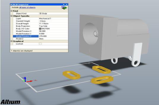 Altium Designer支持将任何3D模型直接导入PCB编辑器,如壳体或安装支架。在PCB设计完成之后,各元器件都包含3D模型的情况下,可以导入电路板PCB的外壳。然后同样使用数字键盘上的空格和箭头键,来调整模型的位置,或使用PCB Inspector面板来测试不同的旋转设置。