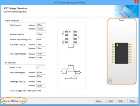 使用手动创建的方法,对于简单的封装是很容易的。但是当器件焊盘数量很多,而且该器件符合IPC封装标准的时候,我们可以使用IPC封装向导来添加3D模型。操作步骤是,到工具“Tools”的下拉菜单,选择“ICP Compliant Footprint Wizard”,即可开启向导。我们只需按照步骤来创建封装。点击下一步,这里我们看到可以创建的,各种封装的类型。选择其中一种封装类型,然后按照向导一步步操作,输入元器件数据手册中的各种参数值。封装创建完毕之后,其STEP模型也顺便一起生成。如下图所示。