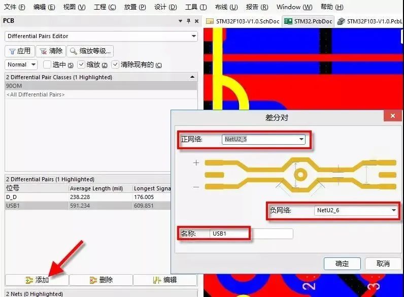 ③ 因为PCB上只有一个差分对,然后这个差分对的网络还是流水号,选择手工添加,单击“添加”按钮,在“正网络”栏中填入“NetU2_5”网络,在“负网络”栏中填入“NetU2_6”网络,并更改名称为“USB1”,完成差分对的添加,如图8所示。