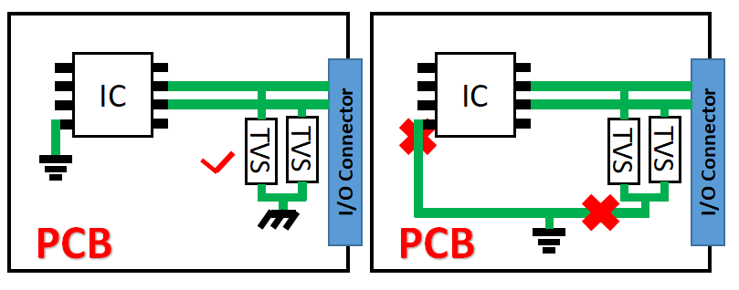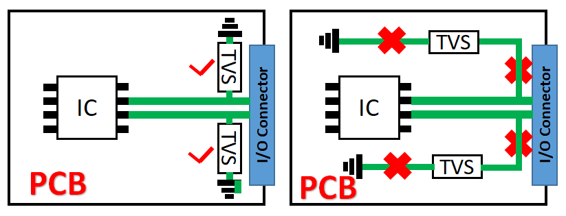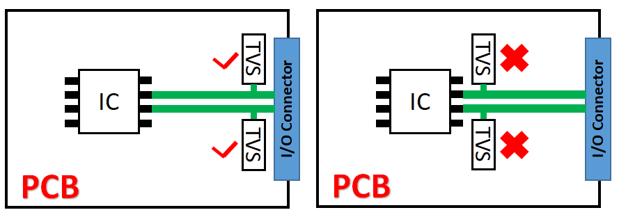 2 TVS放置位置的选择 TVS器件尽量接近噪声源,确保浪涌电压可以在脉冲耦合到邻近PCB导线之前被钳位。