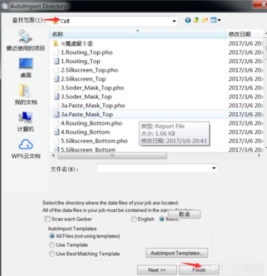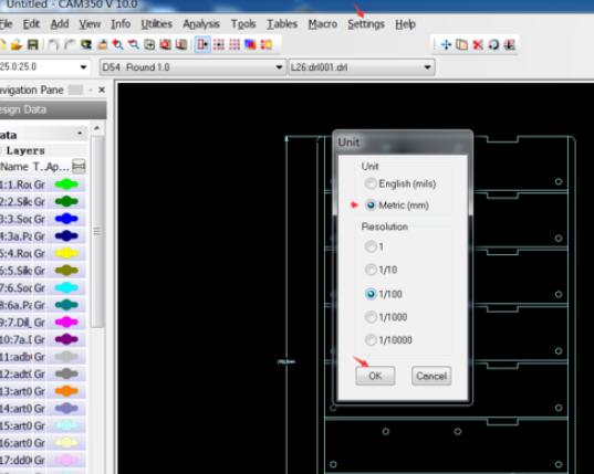 1、导入文件时需注意Gerber的类型,RS-274-X的可直接导入,RS-274-D的有时则需要手动输入D码。因此我们建议在PCB转Gerber时直接转成RS-274-X类型,除钻孔外的各层格式采用英制2:5,钻孔则采用公制3:3,此格式相对稳定,在CAM软件读入时D码不易变形。