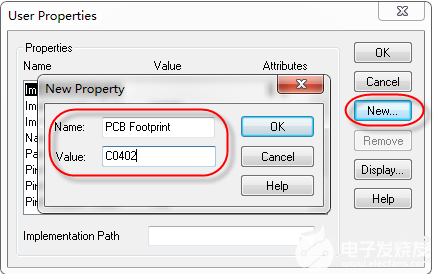 第二步,在弹出的属性框中点击右侧New…,新建属性,Name填写PCB Footprint,Value值填写相对应的封装名,如图2-50所示;