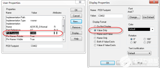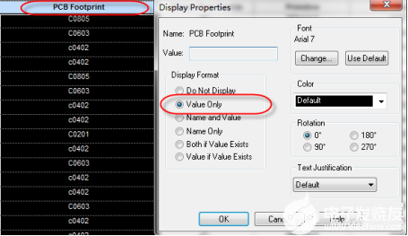 第三步,选中新加的PCB Footprint属性,点击右侧Display…,设置显示的参数,即可对PCB封装名称进行显示或者是隐藏,Do Not Display表示都不显示;Value Only表示只显示Value值,也就是封装名称;Name and Value表示都显示,如图2-51所示: