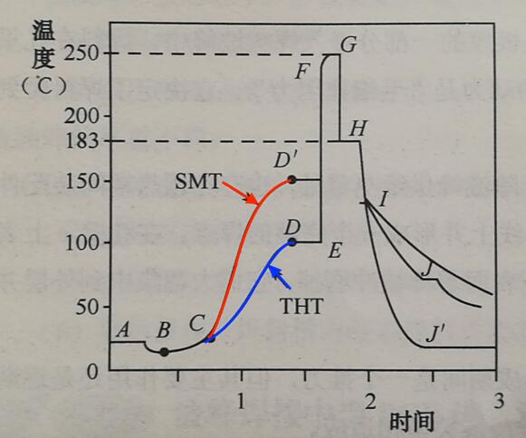 当焊接操作开始,操作者将室温PCBA通过助焊剂涂覆区时,印制板的温度接近于助焊剂的液温,即图中B点。涂覆了助焊剂的PCB从C点开始进入预热区,受热后助焊剂中的溶剂不断被蒸发,而助焊剂中的固体成分开始分解出能净化基体金属的活性物质,在PCB到达D点时,达到预热所要求的温度,这是一般的通孔安装PCBA预热温度曲线。对于SMC/SMD的大量应用的PCBA,由于PCB基板材质、厚度、层数、铜箔黏合剂等因素,决定其热容量的提高,预热温度也随之提高。预热温度被普遍提高到与焊接温度的差值小于100℃以内的程度,如图中红色曲线所示的D‘点(150℃左右)。