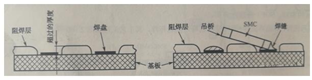 1.阻焊膜过厚超过PCB铜箔焊盘厚度,再流焊时便形成吊桥与开路,如图所示: