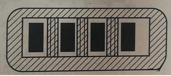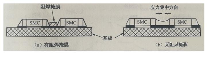 4.当有两个以上靠得很近的SMD,其焊盘共用一条导线时,应用阻焊将其分开,以免焊料收缩时产生应力使SMD移位或者拉裂,如图所示: