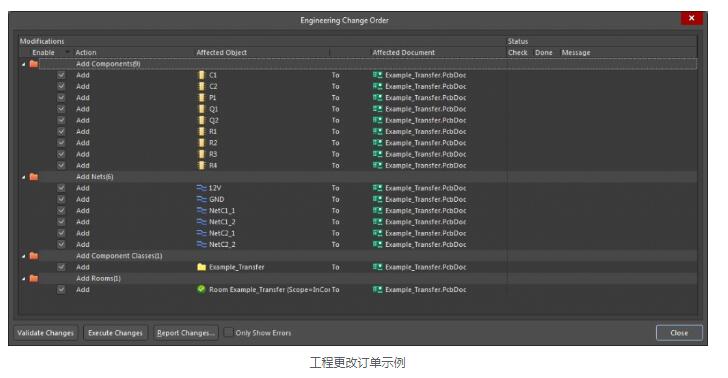PCB设计软件中的所有工具都可以在一个统一的设计环境中使用,在该设计环境中,原理图,PCB和BOM相互关联并且可以同时访问。其他程序会迫使您手动编译原理图数据,要将SchDoc信息传输到新创建的PcbDoc,请单击设计»更新PCB{新PCB的文件名}.PcbDoc。将打开“工程变更单”(ECO)对话框,列出原理图中的所有组件和网络,类似于以下内容。