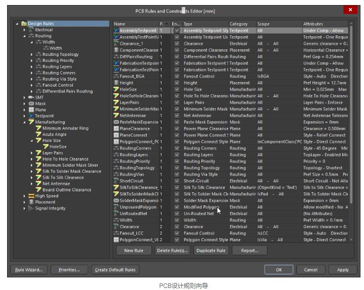 PCB设计规则类别的种类很多,您可能不需要为每个设计使用所有这些可用规则。您可以通过在下面的PCB规则和约束编辑器中的列表中右键单击有问题的规则来选择/取消选择单个规则。