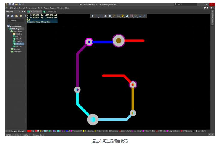 放置完组件和任何其他机械元件之后,就可以准备走线了。确保使用良好的布线指南,并利用PCB设计软件工具简化该过程,例如通过布线突出显示网络和颜色编码,如下所示。