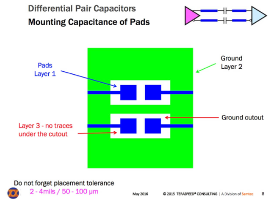 焊盘参考平面挖空,同样是为了阻抗的连续性,为了减少焊盘与参考平面的寄生电容,隔直电容是高速串行通道中阻抗不连续的常见来源。关于优化焊盘阻抗不连续问题,可以参考 Altera的Application Note 530《Optimizing Impedance Discontinuity Caused by Surface Mount Pads for High-Speed Channel Designs》,老wu已经上传的网盘,大家可以参考文章末尾给出的下载方法下载,那参考平面的铜皮该挖空多少合适?视频中也有人提出这个问题,回答是依仿真结果,依不同的层叠结构而不同,最好进行3D仿真。
