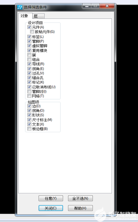 我们的PADS Layout 类似于PADS Logic一样都存在一个过滤器,我们可以根据想要选中对象的种类以及类型去确定光标选择。首先可以在菜单栏中找到过滤器选项,在“编辑-筛选条件”如图3-27所示,: