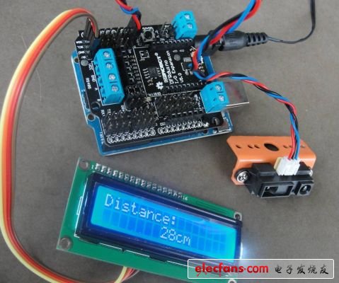 这个实验任务是:把GP2D12红外线测距传感器采集的数据,通过Arduino控制器的算式转换为实际距离值,再显示在集成了I2C接口的LCD1602液晶面板上。