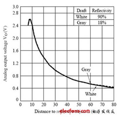 上图就是GP2D12红外线测距传感器的电压值与距离值的关系曲线,从这个曲线可以看出,电压输出与距离成反比,而且是非线性关系。