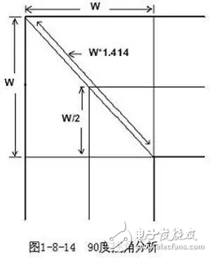 直角走线一般是PCB布线中要求尽量避免的情况,也几乎成为衡量布线好坏的标准之一,那么直角走线究竟会对信号传输产生多大的影响呢?从原理上说,直角走线会使传输线的线宽发生变化,造成阻抗的不连续。其实不光是直角走线,顿角,锐角走线都可能会造成阻抗变化的情况。