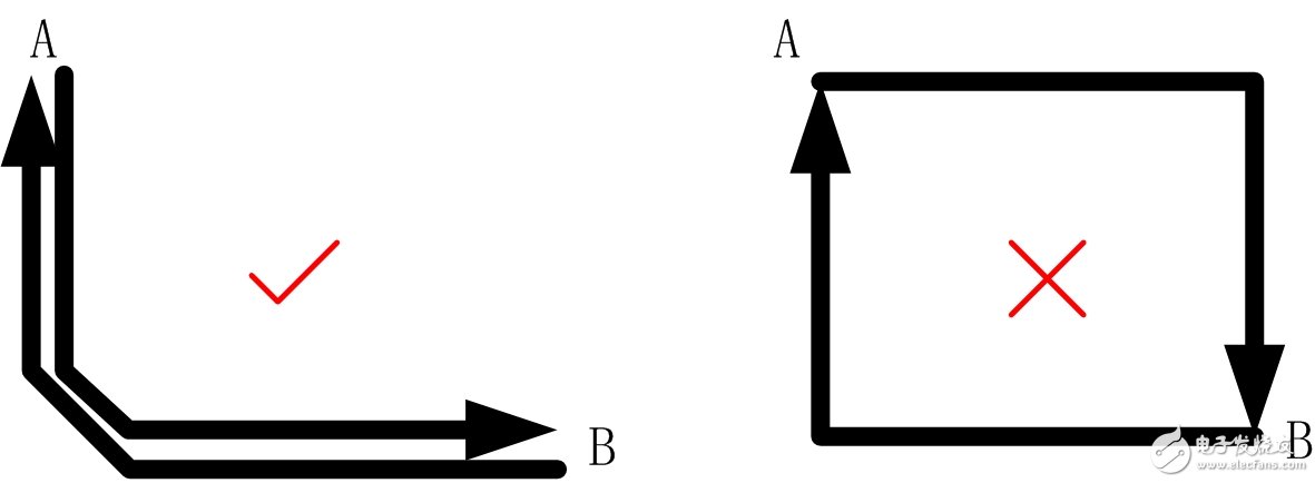 另外若控制线很长,应该将来回的一对线的靠近,或将二者置于PCB的两个面上并正对着,从而减小其环路面积,避免被功率部分的电磁场干扰。如图2说明了A、B两点间,正确与错误的信号线布线方法。