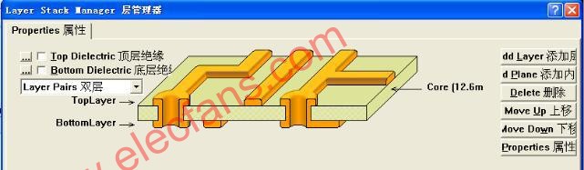 现在我们来添加层,先单击左边的TopLayer, 再单击层管理器右上角的Add Plane按钮,添加内电层,这里说明一下,因为现在讲的是用负片画法的四层板,所以,需要添加内电层,而不是Add Layer。