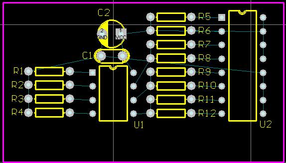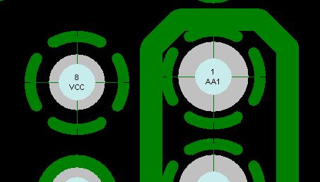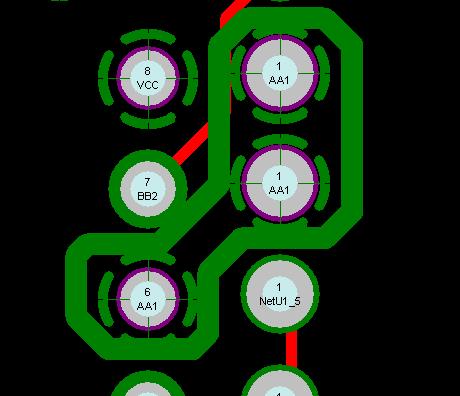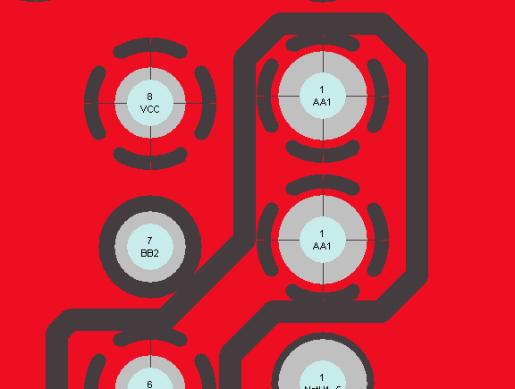 这时,网络为AA1的PAD中心也多了个十字架,说明,AA1网络已经从VCC层将这里焊盘连接起来了,注:千万注意,在内电层中不要再对这些焊盘进行走线了。