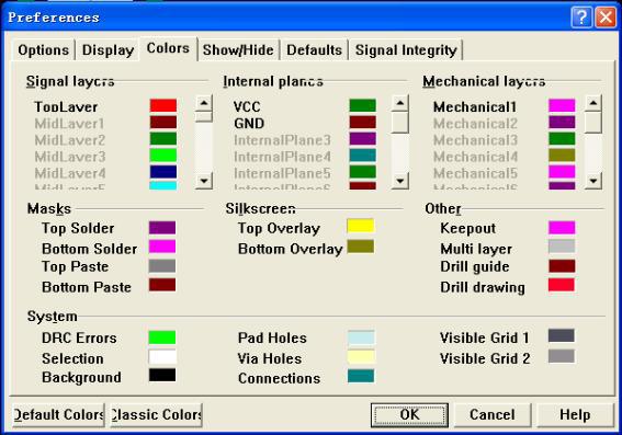 点击后弹出下面的层管理器对话框, 因为在Protel中默认是双面板,所以,我们看到的布线层只有两层。