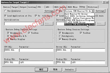 在出现的对话框里在右栏上部的下拉菜单里选中“Proteus VSM Monitor-51 Driver”。并且还要点击一下“Use”前面表明选中的小圆点。再点击“Setting”按钮,设置通信接口,在“Host”后面添上 “127.0.0.1”,如果使用的不是同一台电脑,则需要在这里添上另一台电脑的IP地址(另一台电脑也应安装Proteus)。在“Port”后面添加“8000”。设置好的情形如图所示,点击“OK”按钮即可。最后将工程编译,进入调试状态,并运行。
