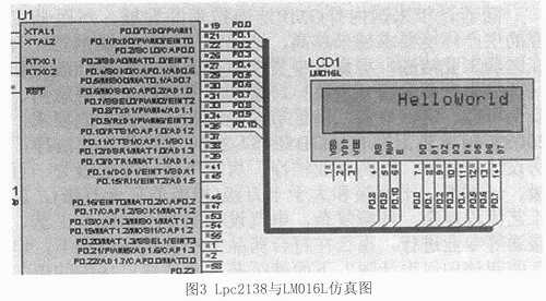 用keil软件编译后生成HEX文件,在Proteus中打开lpc2138芯片属性对话框,将生成的HEX文件加载进去,再进行仿真运行就可以看到图3的结果,说明设计成功。