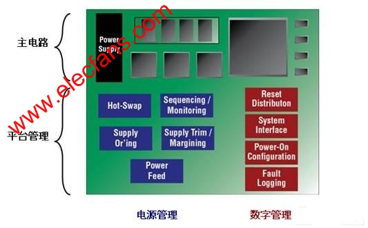 现代电路板使用许多器件,如CPU、FPGA和ASIC来执行主要的处理功能。这些主要的功能器件需要多个安装在电路板上的电源,需要以一个特定的时序开启和关闭,监测故障并对电压的精度进行微调。此外,输入至电路板的功率往往需要冗余电源管理、以及插入电路板,热插拔功能。控制各种电源幅度的所有功能统称电源管理。在电源上电之后,系统需要数字支持功能,如复位分配、为FPGA和ASSP启动配置控制、针对微控制器的看门狗定时器和系统总线接口。这些数字支持功能统称数字化管理。电源和数字化管理一起通常被称为电路板或平台管理。