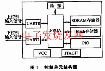 本文设计的控制单元在整个系统中的功能是将地面接收装置接收到的编码信号传回给主站数据处理中心。具体工作过程是,首先存储上位机数据,然后通过误码率测试与计算,选择一条误码率最低的路径作为数据传输路径,最后将存储的上位机数据通过该路径传输到主站数据处理中心进行处理。经过综合考虑,选用了Altera公司的Cyclone II-2C8作为核心芯片,以及外部扩展的SDRAM、Flash、各种输入/输出电路和MAX232接口芯片等,并结合Nios II软核处理器开发套件实现。该控制单元结构如图1所示。