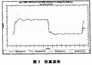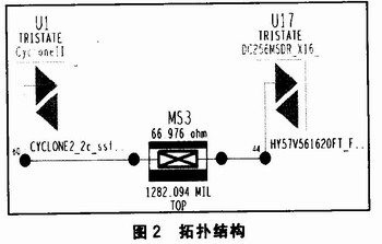发射端为HY57V561620的44引脚,接收端为Cyclone II的60引脚,激励为66 MHz的方波。图2为拓扑结构,图3为仿真波形。
