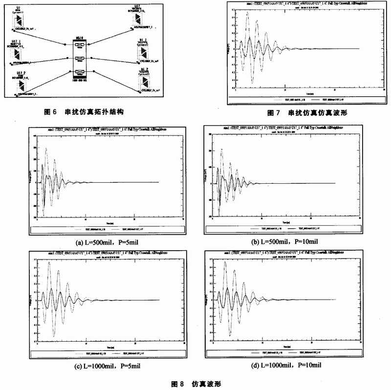 仿真波形如图8所示。由图7可以看出串扰对于被攻击网络的影响还是很大的,串扰值Crosstalk=657.95 mV串扰的大小与传输线的并行耦合长度L和间距P有关,耦合长度越短,间距越大,串扰就越小。仿真结果如表1所列。