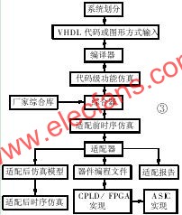高层次设计是一种“概念驱动式”设计,设计人员无须通过门级原理图描述电路,而是针对设计目标进行功能描述。由于摆脱了电路细节的束缚,设计人员可以把精力集中于创造性的方案与概念的构思上,一旦这些概念构思以高层次描述的形式输入计算机,EDA系统就能以规则驱动的方式自动完成整个设计。这样,新的概念就能迅速有效地成为产品,大大缩短了产品的研制周期。不仅如此,高层次设计只是定义系统的行为特性,可以不涉及实现工艺,因此还可以在厂家综合库的支持下,利用综合优化工具将高层次描述转换成针对某种工艺优化的网络表,使工艺转化变得轻而易举。系统级设计的工作流程见图3。首先,工程师按照“自顶向下”的设计方法进行系统划分。其次,输入VHDL代码,这是高层次设计中最为普遍的输入方式。此外,还可以采用图形输入方式(框图,状态图等),这种输入方式具有直观、容易理解的优点。第三步是,将以上的设计输入编译成标准的VHDL文件。第四步是进行代码级的功能仿真,主要是检验系统功能设计的正确性。这一步骤适用大型设计,因为对于大型设计来说,在综合前对源代码仿真,就可以大大减少设计重复的次数和时间。一般情况下,这一仿真步骤可略去。第五步是,利用综合器对VHDL源代码进行综合优化处理,生成门级描述的网络表文件,这是将高层次描述转化为硬件电路的关键步骤。综合优化是针对ASIC芯片供应商的某一产品系列进行的,所以综合的过程要在相应的厂家综合库支持下才能完成。第六步是,利用产生的网络表文件进行适配前的时序仿真,仿真过程不涉及具体器件的硬件特性,是较为粗略的。一般的设计,也可略去这一仿真步骤。第七步是利用适配器将综合后的网络表文件针对某一具体的目标器件进行逻辑映射操作,包括底层器件配置、逻辑分割、逻辑优化、布局布线。第八步是在适配完成后,产生多项设计结果:(1)适配报告,包括芯片内部资源利用情况,设计的布尔方程描述情况等;(2)适配后的仿真模型;(3)器件编程文件。根据适配后的仿真模型,可以进行适配后的时序仿真,因为已经得到器件的实际硬件特性(如时延特性),所以仿真结果能比较精确地预期未来芯片的实际性能。如果仿真结果达不到设计要求,就需要修改VHDL源代码或选择不同速度和品质的器件,直至满足设计要求;最后一步是将适配器产生的器件编程文件通过编程器或下载电缆载入到目标芯片FPGA或CPLD中。如果是大批量产品开发,则通过更换相应的厂家综合库,轻易地转由ASIC形式实现。