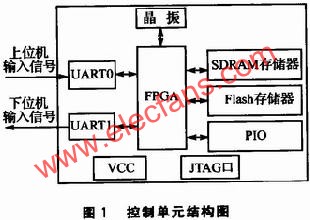 本文设计的控制单元在整个系统中的功能是将地面接收装置接收到的编码信号传回给主站数据处理中心。具体工作过程是,首先存储上位机数据,然后通过误码率测试与计算,选择一条误码率最低的路径作为数据传输路径,最后将存储的上位机数据通过该路径传输到主站数据处理中心进行处理。经过综合考虑,选用了Altera公司的Cyclone II-2C8作为核心芯片,以及外部扩展的SDRAM、Flash、各种输入/输出电路和MAX232接口芯片等,并结合Nios II软核处理器开发套件实现。该控制单元结构如图1所示。