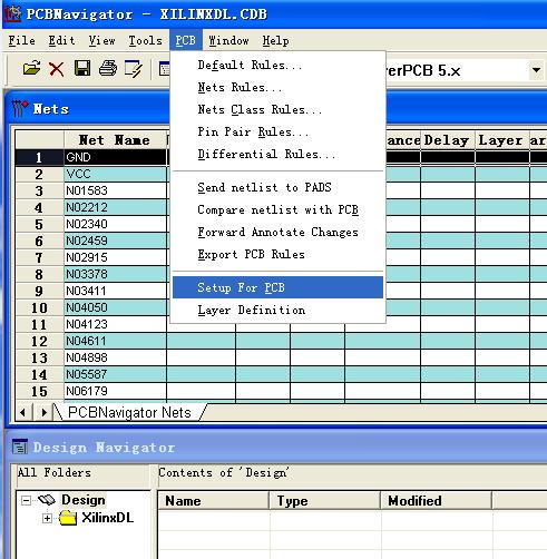 2. 在Orcad的Project Manager中启动PCBNavigator。在PCBNavigator中选择菜单PCB-Setup for PCB:
