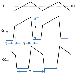 在频域内测量辐射和传导电磁干扰,这就是对已知波形做傅里叶级数展开,本文中我们着重考虑辐射电磁干扰性能。在同步降压转换器中,引起电磁干扰的主要开关波形是由Q1和Q2产生的,也就是每个场效应管在其各自导通周期内从漏极到源极的电流di/dt。图2所示的电流波形(Q1on和Q2on)不是很规则的梯形,但是我们的操作自由度也就更大,因为导体电流的过渡相对较慢,所以可以应用Henry Ott经典著作《电子系统中的噪声降低技术》中的公式1。我们发现,对于一个类似的波形,其上升和下降时间会直接影响谐波振幅或傅里叶系数(In)。