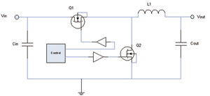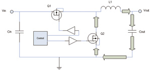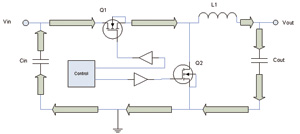 当Q1关断、Q2导通时,就形成了第二个回路。之后存储在L1内的能量流经输出电容器和Q2,如图5所示。这些回路面积控制对于降低电磁干扰是很重要的,在PCB走线布线时就要预先考虑清器件的布局问题。当然,回路面积能做到多小也是有实际限制的。
