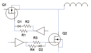 谐波系列的电磁干扰幅度受Q1和Q2的通断影响。在测量漏源电压VDS的上升时间tr和下降时间tf,或流经Q1和Q2的电流上升率di/dt时,可以很明显看到这一点。这也表示,我们可以很简单地通过减缓Q1或Q2的通断速度来降低电磁干扰水平。事实正是如此,延长开关时间的确对频率高于f=1/πtr的谐波有很大影响。不过,此时必须在增加散热和降低损耗间进行折中。尽管如此,对这些参数加以控制仍是一个好方法,它有助于在电磁干扰和热性能间取得平衡。具体可以通过增加一个小阻值电阻(通常小于5Ω)实现,该电阻与Q1和Q2的栅极串联即可控制tr和tf,你也可以给栅极电阻串联一个“关断二极管”来独立控制过渡时间tr或tf(见图3)。这其实是一个迭代过程,甚至连经验最丰富的电源设计人员都使用这种方法。我们的最终目标是通过放慢晶体管的通断速度,使电磁干扰降低至可接受的水平,同时保证其温度足够低以确保稳定性。