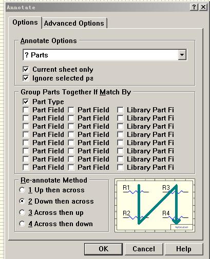2.接着Tools->Annotate,在Option选项中,我们把Annotate Option选为: ?Parts,勾选Current sheet only和Ignore selected part,接着在Re-annotate Method中选择你需要排列的顺序,具体设置请看图2.