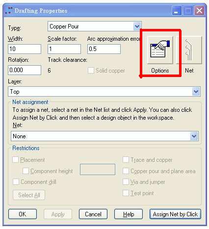 (2) 绘制 Copper pour 后呼叫Properties,并使用Options
