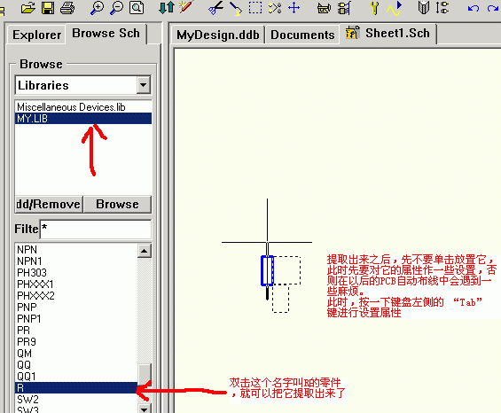 1.如何调出SCH零件进行并且进行属性设置