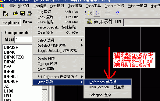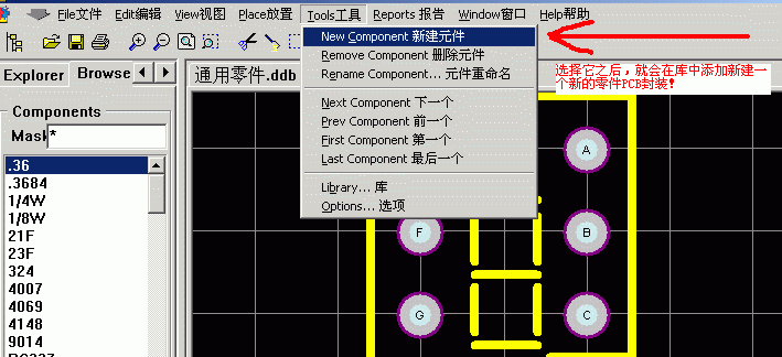 1.打开在前几课已经做过的PCB,选择那个我给大家提供的封装库,然后按着图选择编辑按纽就进入了PCB封装编辑器