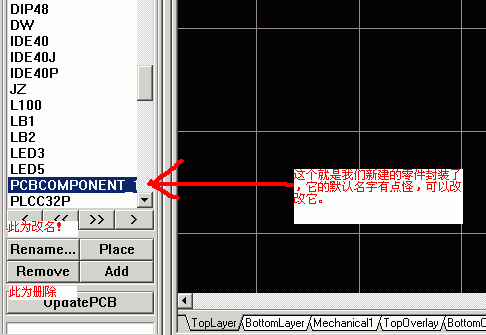9.可以开始做封装了,注意哪些中文注释,核心问题就是焊盘的名称,但愿你还记得做SCH零件的重点>>