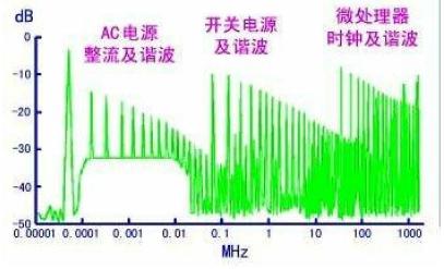 图14 给出了日常生活中常用的频率范围,包括交流电源频率、音频、长、中、短波收音机占有的频段、调频及电视广播、蜂窝电话常用的900MHz 及1.8GHz。但实际的频谱远比这拥挤得多,9KHz 以上的频段几乎都被用于特定的场合。随着微波技术广泛应用于日常生活,该图中所示的频率也很快将扩展至10GHz(甚至100GHz)。图15 在图14 上覆盖了一些大家不太熟悉的频谱,这些频谱是普通电气及电子设备所发射的。