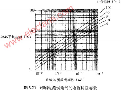 图5.23描述了最大的功率输送能力和温度上升的关系。在图5.23中,水平轴显示的是横截面面积,单位为IN的2次方,纵轴显示的是该线在给定升温值时的允许电流。