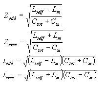 为便于分析,差分线对常常根据它的奇模和偶模阻抗和延迟来描述,而这些与其差模和共模对应的部分是密切相关的,因此可以用方程1 来计算。