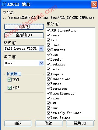 注意属性全选,输出格式要参考安装的Cadence版本所支持的PADS转化版本,我安装的Cadence版本是15.0,选择的是PowerPCB V 4.0。