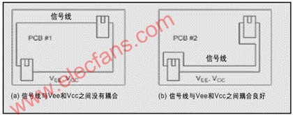 如图2(a)所示,信号线与Vee或Vcc之间几乎没有耦合;而图2(b)中,信号线与Vee或Vcc的耦合良好。图2(b)的信号线布局方法,可以减少两个电路模块之间有效电感的数值,从而减少两个电路参考点之间的电压差。